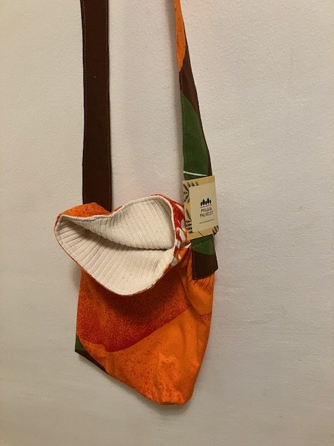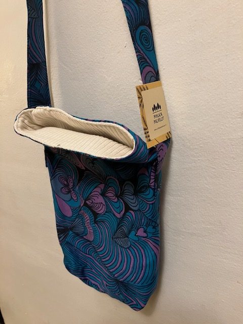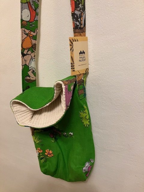 Puuvillasta valmistetut laukut ovat kooltaan noin 30 cm x 20 cm. Pintamateriaalina on käytetty retrokangasta. Puuvillalaukun sisäpinnan alkuperä on Ruotsin armeijan käyttämättömissä ylijäämäkalsareissa. Kuosivaihtoehtoja on useita. Hinta 28 e.